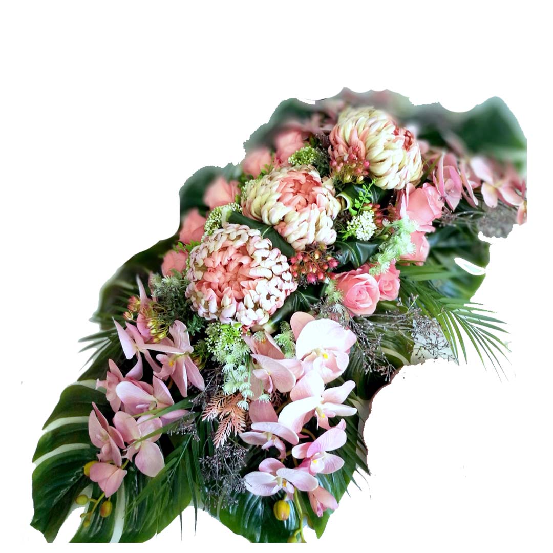 Stroik nagrobny Zgaszony róż nr 562 jest to elegancka, duża kompozycja kwiatowa. Dekorację osadziliśmy w betonowej podstawie. Piękne chryzantemy w wyjątkowej kolorystyce, satynowe storczyki i zielone dodatki tworzą uroczą kompozycję. Kwiaty zastosowane do tej dekoracji nagrobnej są w klimatycznych kolorach i dekoracja długo będzie prezentować się pięknie. Prosta forma nadaje kompozycji lekkości i elegancji. Wysokiej jakości kwiaty oraz harmonia kompozycji pięknie będzie prezentować się zarówno na ciemnym jak i jasnym nagrobku. Dekoracja ta jest niespotykana a zielone elementy podkreślają kolor zastosowanych elementów.