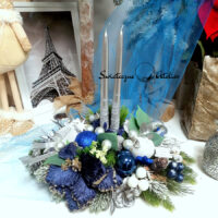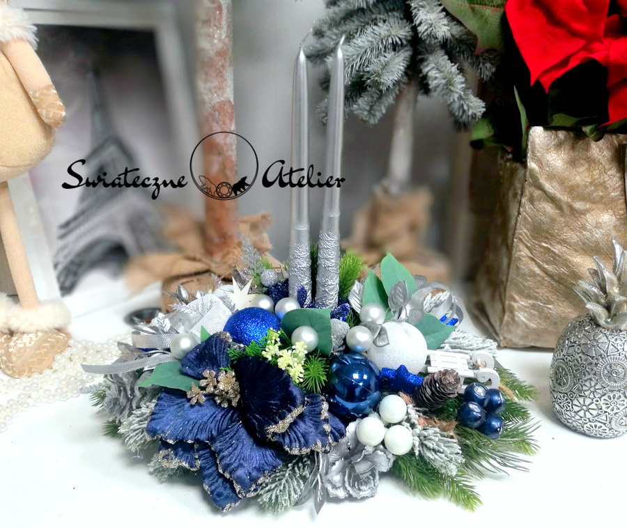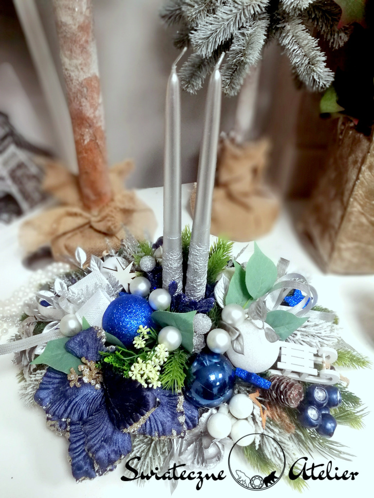 Stroik świąteczny Cicha noc nr 1115 to piękna dekoracja z naszej pracowni. Dekoracyjne świece zostały osadzone na ozdobnej, lustrzanej tacy. Kompozycja została udekorowana sztucznymi gałązkami świerku, bombkami i owocami. Całość wykonana ze sztucznych elementów. Uroczy kwiat magnolii podkreśla kolorystykę. Jest to wyjątkowo elegancka dekoracja, która sprawi, że wnętrze rozbłyśnie świątecznym nastrojem. Świetna dekoracja, która długo będzie wyglądać pięknie.