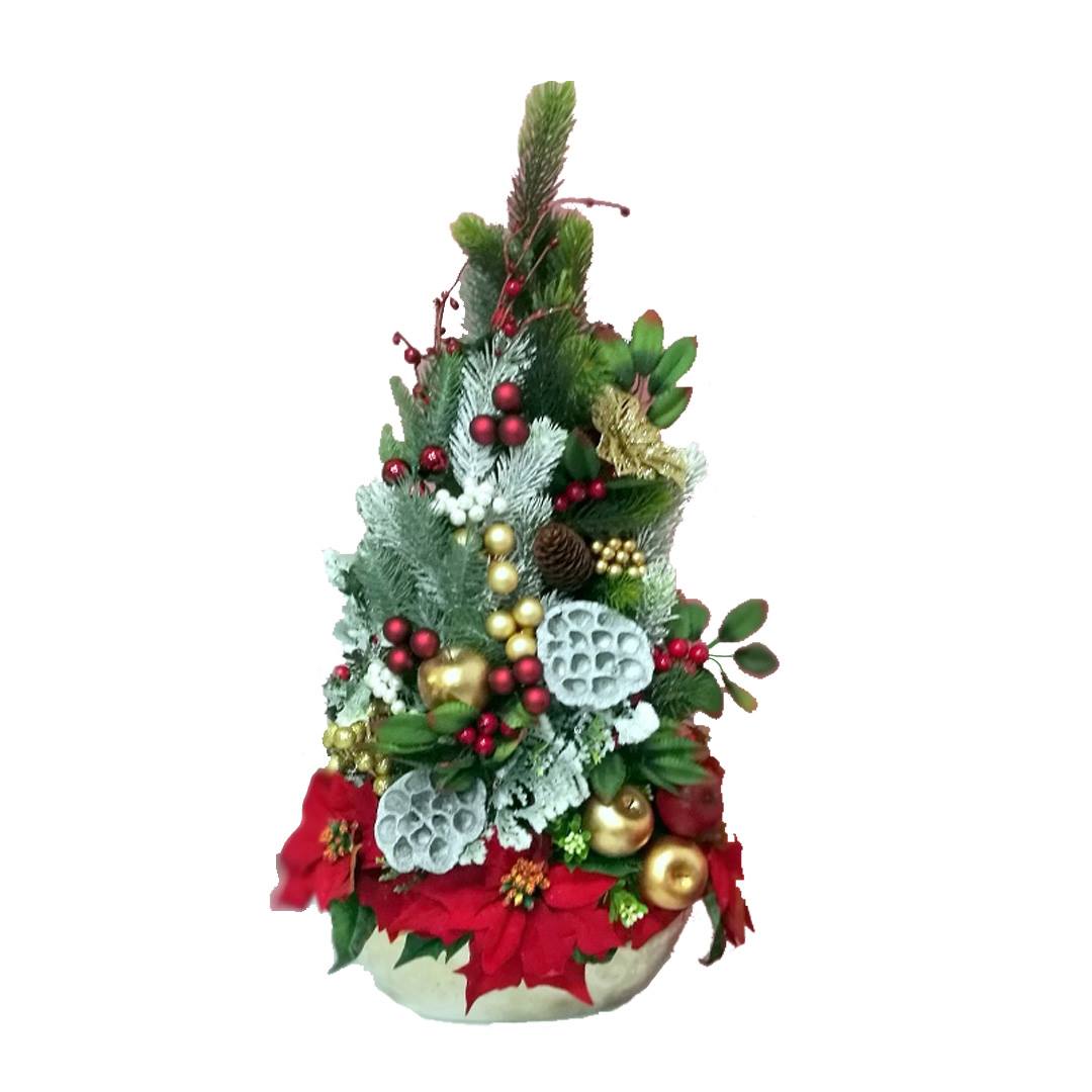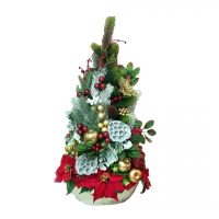Stroik świąteczny Wigilijny poranek nr 383 jest to śliczna dekoracja, która będzie cieszyć oko przez długi czas. Pięknie będzie się prezentować zarówno na stole jak i komodzie. Stroik wykonany został z wysokiej jakości materiałów, będzie elegancko prezentować się w tym wyjątkowym okresie. Iglaste gałązki, bombki, gałązki jarzębiny oraz zielone dodatki wykorzystane w kompozycji pięknie ze sobą współgrają tworząc śliczną dekorację. Dodatki, które zastosowałyśmy do tej dekoracji świątecznej są w pięknych odcieniach czerwieni, złota i bieli. Prosta forma nadaje kompozycji lekkości i elegancji. Wysokiej jakości kwiaty oraz harmonia kompozycji ślicznie udekoruje zarówno ciemny jak i jasny mebel. Zielone elementy kompozycji podkreślają kolor bombek. Piękna, welurowa gwiazda betlejemska znakomicie się prezentuje dodając uroku kompozycji. Dekoracja osadzona w złotej, porcelanowej donicy.