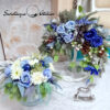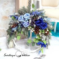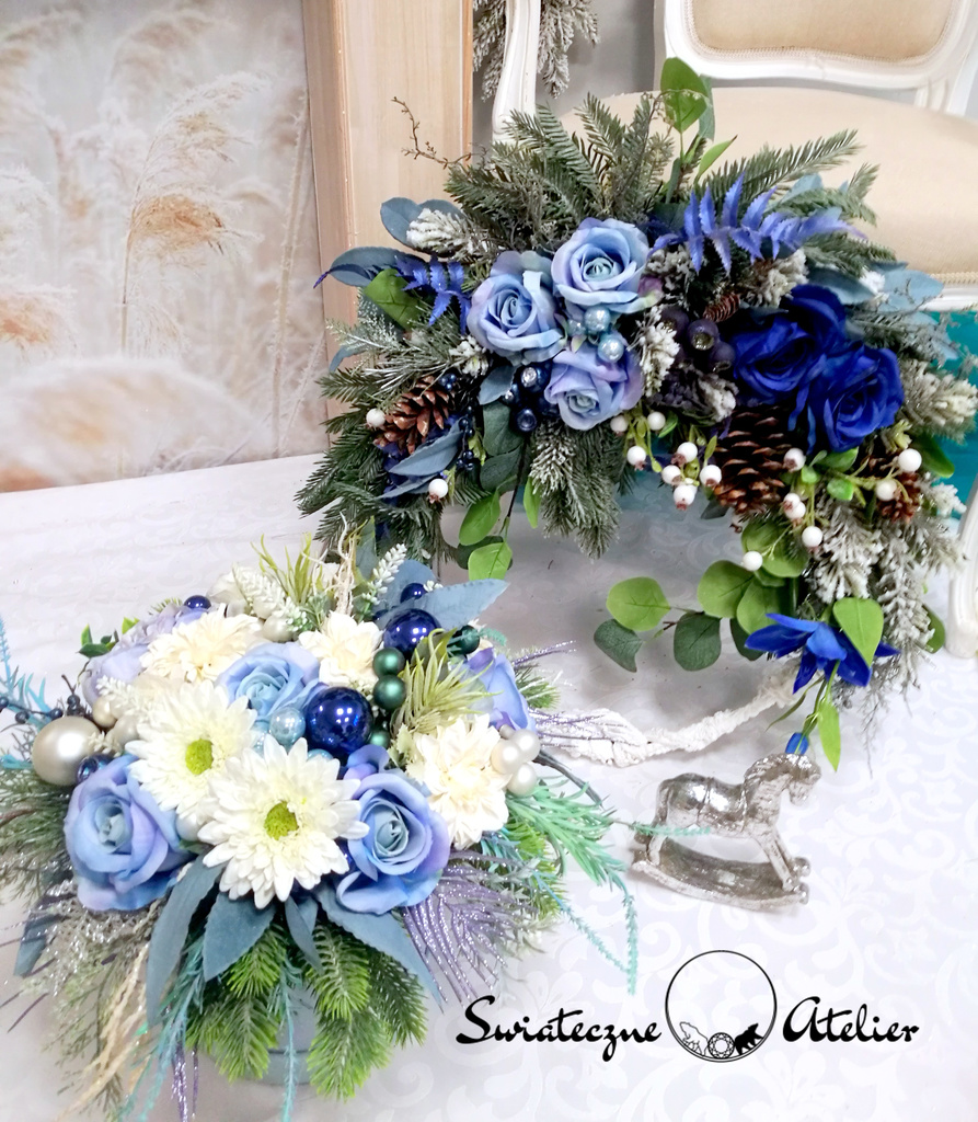 Świąteczny flowerbox i wianek nr 862 to piękna kompozycja umieszczona w niebieskim pudełku pokrytym miękkim meszkiem oraz wianek na obręczy. Wysokiej jakości sztuczne gałązki różnych gatunków drzew iglastych uzupełnione zostały zamarzniętymi różami oraz bombkami. Sztuczne róże, bombki, gałązki znakomicie się uzupełniają i tworzą harmonijną całość. Kwiatostany są miękkie i delikatne w dotyku, do złudzenia przypominają naturalne. Flower box znakomicie nadaje się na prezent. Podsumowując, kompozycja jest urocza, znakomicie nada się na prezent podkreślając świąteczny nastrój wnętrza. Wianek jest okazały, w pięknej zimowej kolorystyce. Świąteczny flowerbox i wianek nr 862 to piękna dekoracja dla miłośników nietuzinkowych dodatków do wnętrza. Pięknie ozdobi salon, kominek czy też jadalnię. Zarówno pudełko jak i wianek są trwałe, ponieważ stworzone zostały ze sztucznych elementów. Może stanowić wyszukany prezent dla tych, którzy gustują w niecodziennych dekoracjach domu.