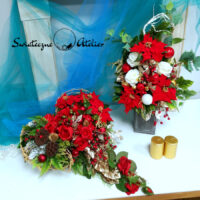 Świąteczny serce i bukiet nagrobny nr 1110 jest to uroczy komplet składający się z kompozycji leżącej oraz bukietu do wazonu. Pięknie będzie się prezentować zarówno na ciemnym jak i jasnym nagrobku. Stroik powstał z wysokiej jakości materiałów, więc na pewno elegancko zaprezentuje się w tym wyjątkowym okresie. Iglaste gałązki, bombki i oraz zielone dodatki, jakie wykorzystaliśmy w kompozycji pięknie ze sobą współgrają tworząc śliczną dekorację. Dodatki, które zastosowaliśmy do tej dekoracji świątecznej są w pięknych odcieniach czerwieni i złota. Prosta forma nadaje kompozycji lekkości i elegancji. Zielone elementy kompozycji podkreślają kolor bombek. Bukiet został osadzony w plastikowym wkładzie, natomiast stroik w drewnianym lampionie. Dekoracja jest przepiękna i niespotykana.