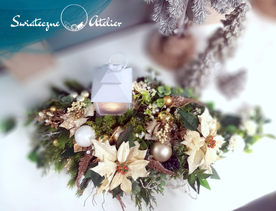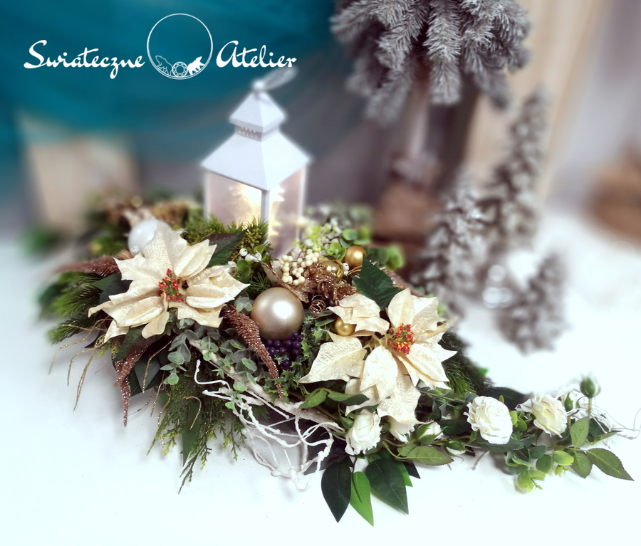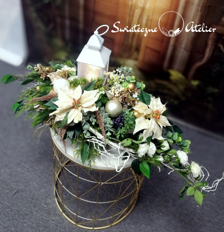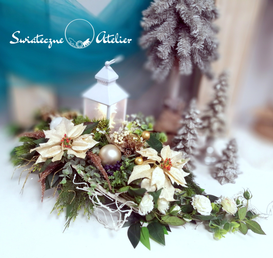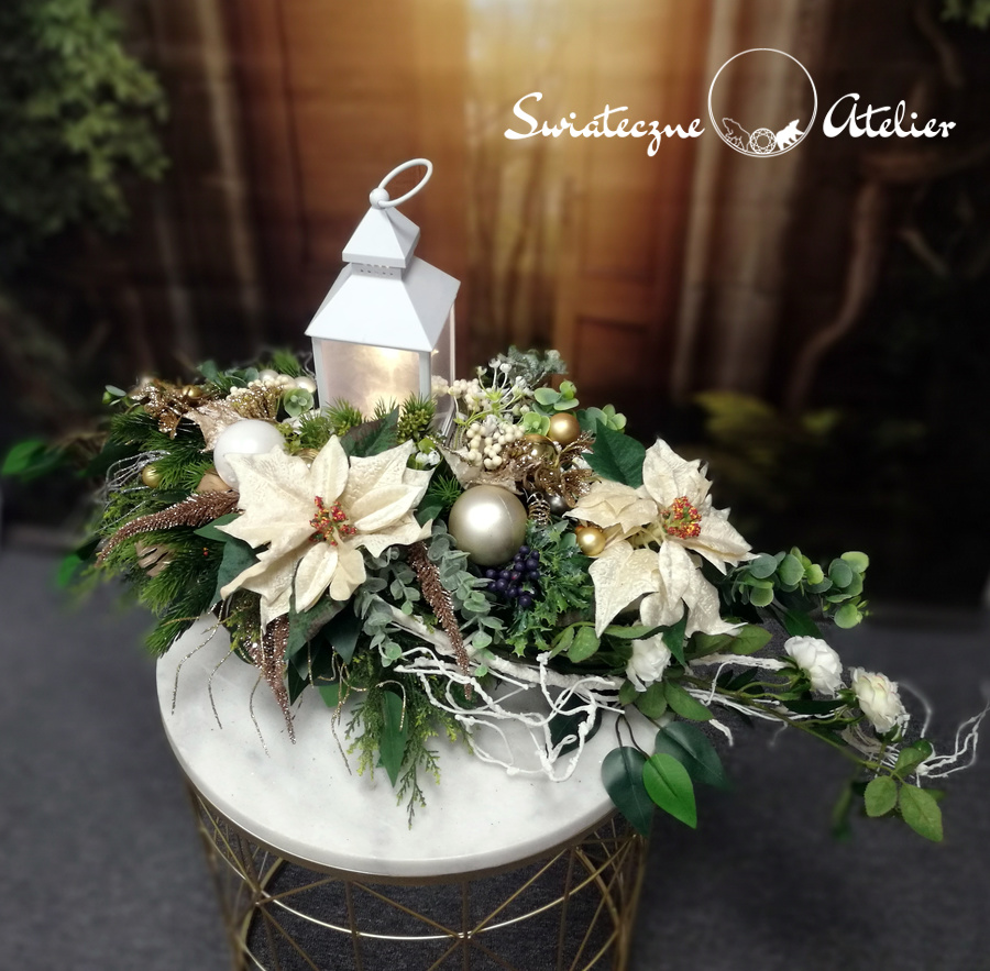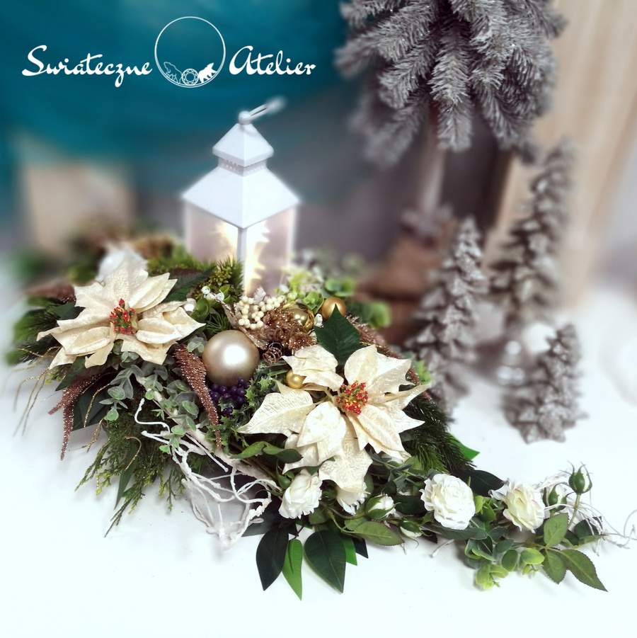 Świąteczny stroik nagrobny Biała gwiazda nr 1126 jest to urocza kompozycja świąteczna. Na dekorację nagrobną składają się iglaste gałązki, róże, gwiazdy betlejemskie, dekoracyjne bombki, ozdobne listki. Prosta forma nadaje kompozycji lekkości i elegancji. Gałązki i róże pięknie ze sobą współgrają tworząc harmonijną całość. Stroik praktycznie na każdym nagrobku będzie się prezentować pięknie ze względu na swoją ciekawą formę oraz piękną kolorystykę. Dekoracyjna latarnia nie jest na trwałe przymocowana do pod łoża dzięki temu będzie można wymienia baterie.