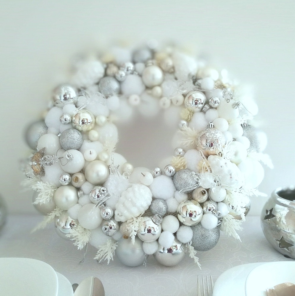 Świąteczny wianek w bieli nr 142 to piękna i subtelna dekoracja wnętrza. Pełen białych i srebrnych bombek pięknie będzie prezentował się na świątecznym stole, znakomicie podkreślając świąteczny nastrój. Akrylowe baletnice i aniołki dyskretnie połyskują wśród bombek. Ośnieżone gałązki pięknie podkreślają kolorystykę. Jest to cudowna dekoracja dla miłośników bieli i nietuzinkowych dodatków. Świetnie nadaje się na prezent.