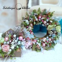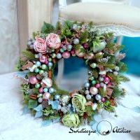 Wianek świąteczny Kraina czarów nr 245 jest to urocza kompozycja świąteczna. Wykonana ręcznie z wysokiej jakości materiałów przez naszego florystę.  Gwarantuje to, że każdy wianek jest inny i niepowtarzalny. Do dekoracji wykorzystałyśmy gałązki PE, dodatki w kolorze delikatnego różu, błękitu, srebra i subtelnej zieleni. Gałązki zamarzniętego bluszczu, eukaliptus, cynamon podkreślaj zimowy charakter. Uroku dodają śliczne łyżwy, pierniczki i delikatne bombki. Całość utrzymana w delikatnej kolorystyce. Wianek jest bardzo elegancki i klimatyczny.  Wianek pięknie udekoruje wasze drzwi, salony czy też kuchnię. Znakomicie sprawdzi się jako nietuzinkowy prezent.