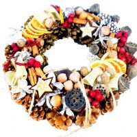 Wianek świąteczny Natura nr 117 to piękna i subtelna dekoracja wnętrza. Ozdobiliśmy go naturalnym suszem, pachnącymi pomarańczami i cynamonem, zaprezentuje się świątecznym stole, znakomicie podkreślając świąteczny nastrój. Jasne jutowe kokardy oraz szyszki wygodnie rozłożyły się na wianku, więc tworzą dynamiczne zestawienie elementów. Jest to cudowna dekoracja dla miłośników naturalnych elementów wnętrza. Swietnie nadaje się na prezent.