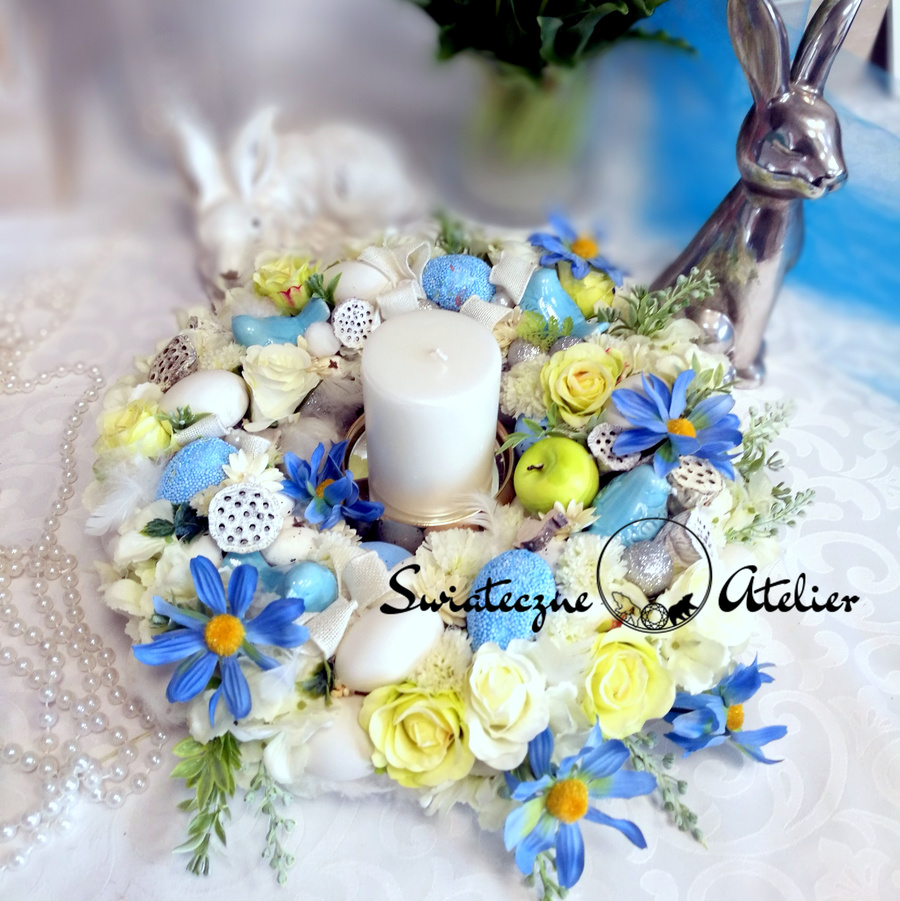 Wianek wielkanocny Wiosenny czas nr 205 to prześliczna dekoracja wiosenna. Piękne wiosenne dodatki w kolorze bieli, błękitu i zieleni tworzą niepowtarzalną kompozycję wiosenną. To piękna dekoracja, która doda uroku każdemu wnętrzu. Doskonale będzie się komponował z Twoim wnętrzem, gdy postawisz go w salonie czy sypialni, czy pokoju kąpielowym. Piękna, wiosenna dekoracja do powieszenia na drzwi, czy też położenia na stole lub komodzie. Polecamy również do dekoracji hoteli, biur i restauracji. Wianek został uzupełniony kolorową wstążką oraz porcelanowym dodatkami. Całość wygląda bajkowo. Wianek stanowi część kolekcji, w skład której wchodzą dekoracje na stół, girlanda, wianki oraz kule kwiatowe.