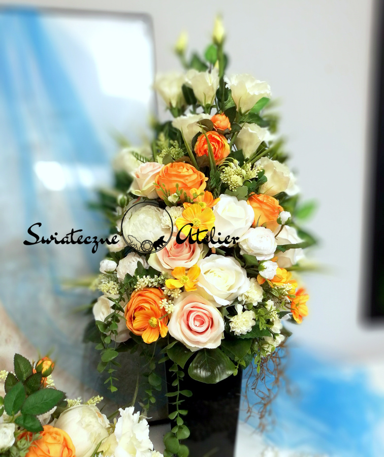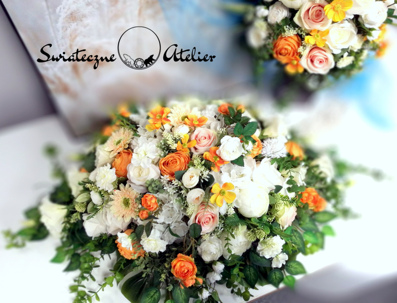 Wszystkie kwiaty wykorzystane w kompozycji to dobrej jakości sztuczne kwiaty i doskonale imitują te prawdziwe.