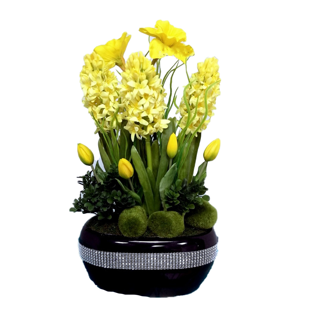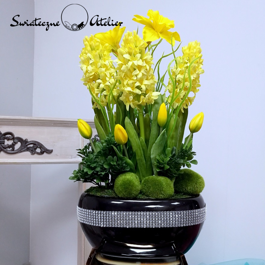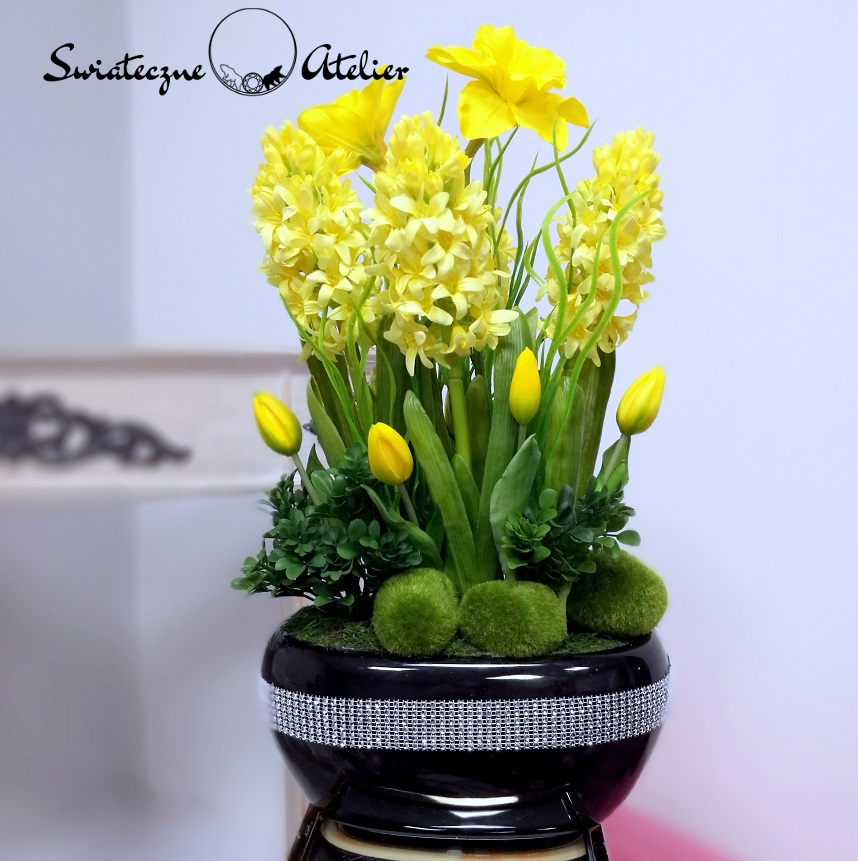 Całość dekoracji Wiosenna kompozycja kwiatowa żółta nr 1159  wygląda niezwykle realistycznie. Poprzez wyselekcjonowane kwiaty, cudownej jakości niejedna osoba mogłaby pomylić je z naturalnymi. Niewątpliwie ich zaletą jest świeży i piękny wygląd przez długi czas, bez dodatkowej pielęgnacji.