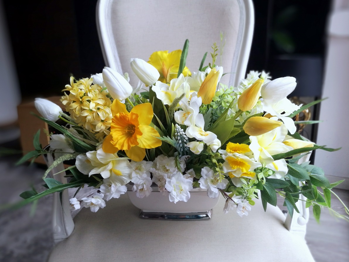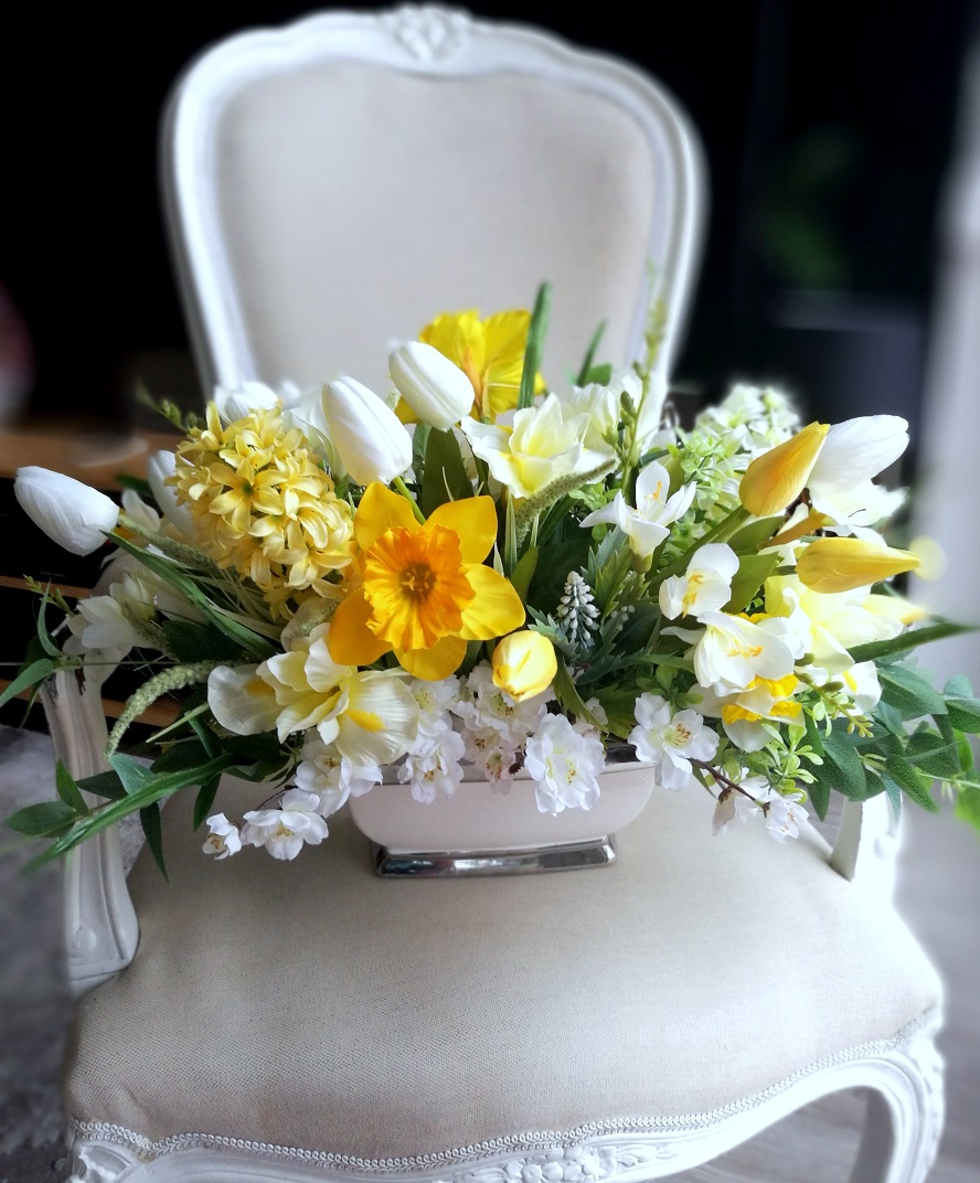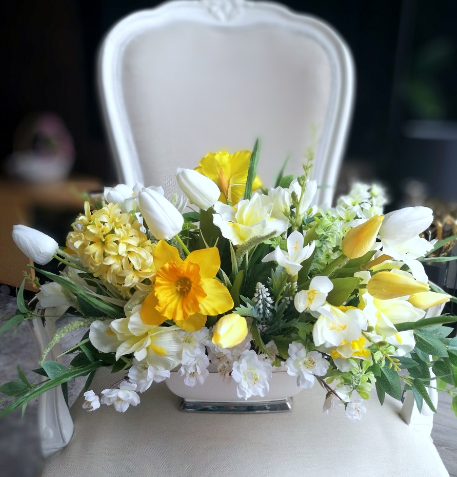 Wiosenne kwiaty w białym naczyniu nr 297 to przepiękna, urocza kompozycja umieszczona w delikatnej, białej donicy. Wykorzystaliśmy tu wysokiej jakości sztuczne kwiaty, które tworzą niepowtarzalną kompozycję. Rośliny do złudzenia przypominają naturalne, dlatego z pewnej odległości trudno odróżnić je od prawdziwych. Dekoracja znakomicie nadaje się na prezent. Dekoracja jest urocza i sprawdzi się w każdym wnętrzu, nadając wiosennego charakteru.