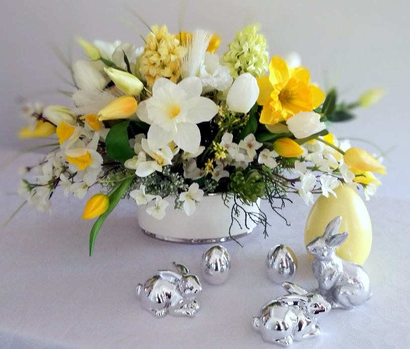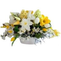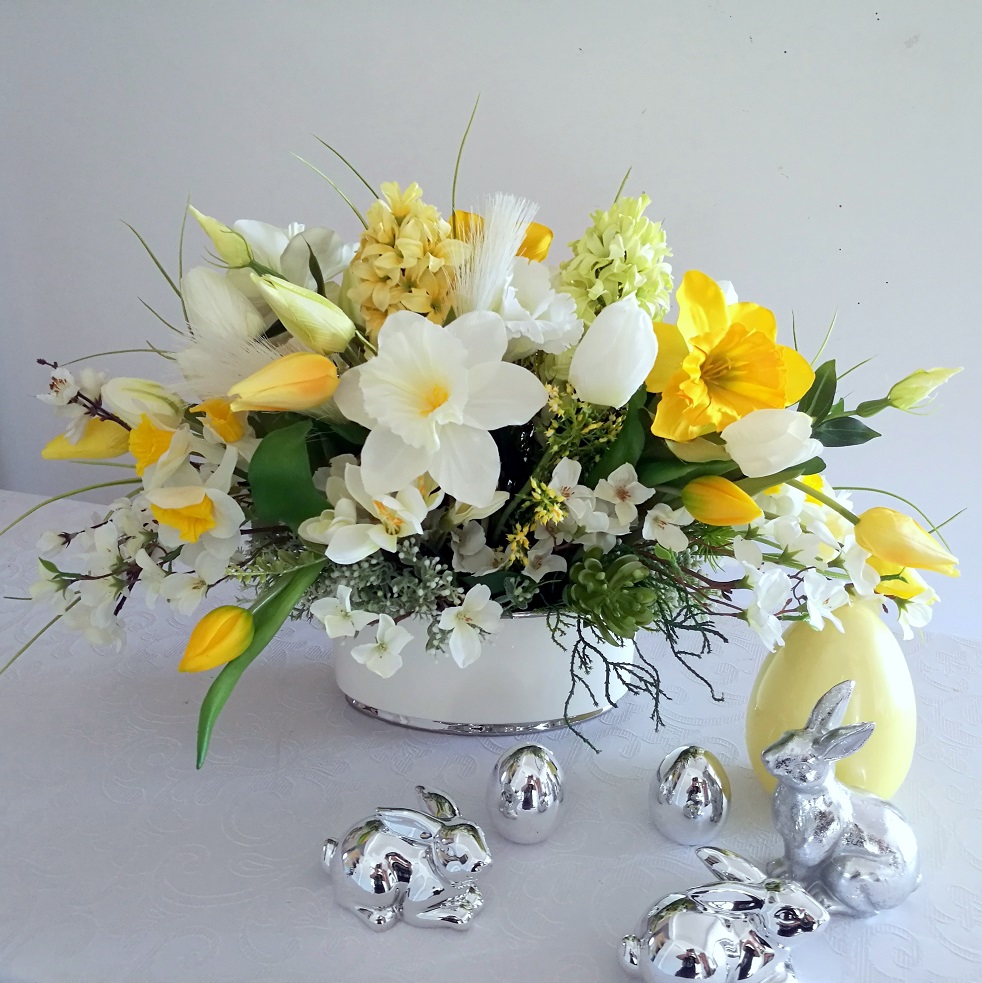 Wiosenne kwiaty w białym naczyniu nr 305 to przepiękna, urocza kompozycja umieszczona w delikatnej, białej donicy. Wykorzystaliśmy tu wysokiej jakości sztuczne kwiaty, które tworzą niepowtarzalną kompozycję. Rośliny do złudzenia przypominają naturalne. Piękne wiosenne kwiaty takie, jak hiacynty, żonkile, kilka gatunków tulipanów, uzupełnione zielonymi dodatkami tworzą niepowtarzalną kompozycję. Dekoracja znakomicie nadaje się na prezent. Dekoracja jest urocza, sprawdzi się w każdym wnętrzu, nadając wiosennego charakteru. Fantastycznie będzie się prezentować w nowoczesnych wnętrzach zarówno formalnych jak i mniej formalnych. Utrzymana jest w pięknych kolorach, więc wniesie radość do Waszych wnętrz i przywoła uśmiech na twarzy. Taką kompozycję, możemy dla Was przygotować także w innych kolorach, dzwońcie, piszcie, pytajcie.