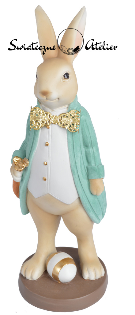 Zając wielkanocny z marchewką zielony to piękna, sezonowa dekoracja. Ta elegancka figurka, która może wspaniale ozdobić Twoje mieszkanie na czas Świąt Wielkanocnych. Śliczna postać wykonana w kremowo zielonej kolorystyce ze złotymi dodatkami to naprawdę rarytas dekoracyjny. Zajączek w ślicznym welurowym surducie wygląda bardzo elegancka i stylowo.  Wniesie dużo wiosenno-radosnego nastroju. Zachwyci nie tylko najmłodszych, ale również tych starszych domowników czy gości. Klasyczna kolorystyka będzie świetnie kontrastować z każdym bukietem lub inną kompozycją z kwiatów, którą wykorzystacie do dekoracji.