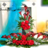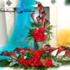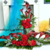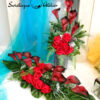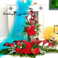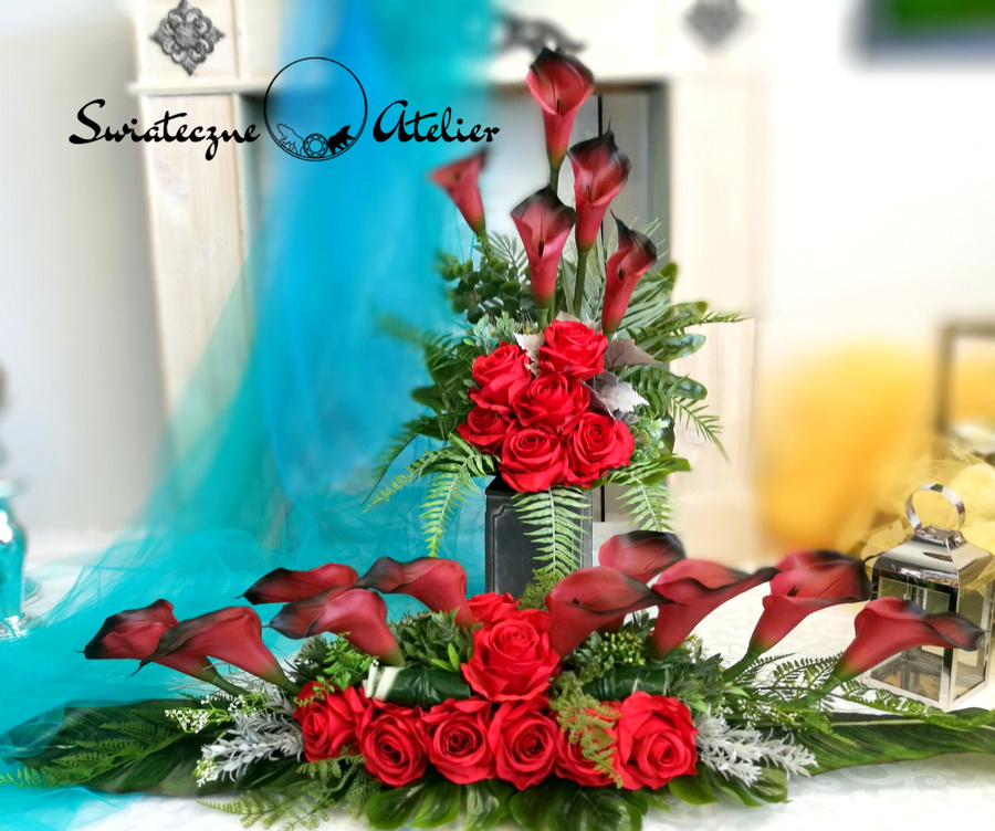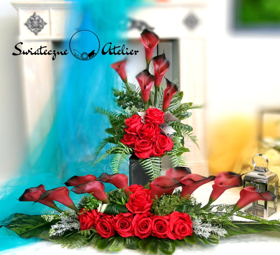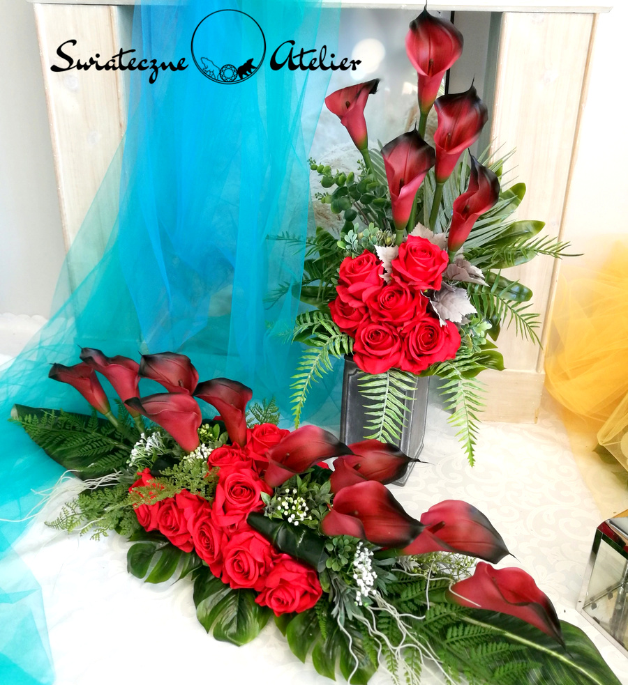 Zestaw nagrobny Bordowa kalia nr 842 jest to unikatowa i nietuzinkowa kompozycja kwiatowa składająca się z bukietu oraz kompozycji leżącej. Stroik leżący to niezwykle elegancka i duża dekoracja mająca prawie 100 cm długości. Na dekorację nagrobną składają się głównie róże jak i gumowe kalie uzupełnione elementami zielonymi. Elementy zielone zastosowane w tej kompozycji nagrobnej to: paproć, liście bananowca oraz liście monstery, uzupełnione drobnymi kwiatami i owocami. Całość sadziliśmy na betonowej podstawce, by zachowała stabilność przy zmiennych, typowych dla naszego klimatu, warunkach pogodowych. Prosta forma nadaje kompozycji lekkości i elegancji. Kalie i róże pięknie ze sobą współgrają tworząc harmonijną całość. Bukiet oraz stroik praktycznie na każdym nagrobku zaprezentuje się pięknie ze względu na swoją okazałą formę oraz piękny odcień czerwieni. Bukiet umieszczony we wkładzie dzięki strzelistej formie i pięknej kolorystyce nikogo nie pozostawi obojętnym.