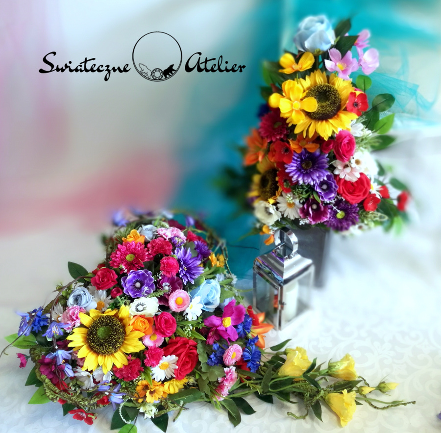 Zestaw nagrobny bukiet i serce Lipcowa łąka nr 769 to śliczna, kompleksowa dekoracja przeznaczona na cmentarz. Przepiękne polne kwiaty, uzupełniają drobne kwiaty, gałązki paprotki, drobne trawy. Dekoracja w całości została wykonana ze sztucznych elementów, które do złudzenia przypominają naturalne. Kompozycję pięknie zdobią gumowe listki monstery i bluszczu. Stroik ze względu na kolorystykę znakomicie będzie prezentował się na nagrobku. Piękne serce będzie ponadczasową dekoracją. Kompozycja jest niespotykana i wyjątkowa.