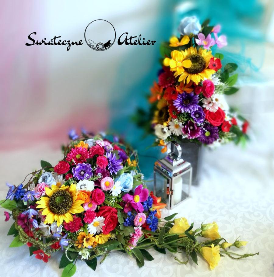 Każdą z naszych dekoracji wykonujemy ręcznie, więc gwarantujemy, że dekoracja, którą Wam dostarczymy, będzie jedyna w swoim rodzaju. Ze względu na to, że nasze kompozycje wykonujemy są za każdym razem ręcznie oraz sezonowość wykorzystywanych w kompozycjach dodatków – kompozycja przygotowana dla Państwa może delikatnie różnić się od przedstawionej na zdjęciu. Gwarantujemy natomiast jakość i estetykę wykonania Państwa zamówienia.