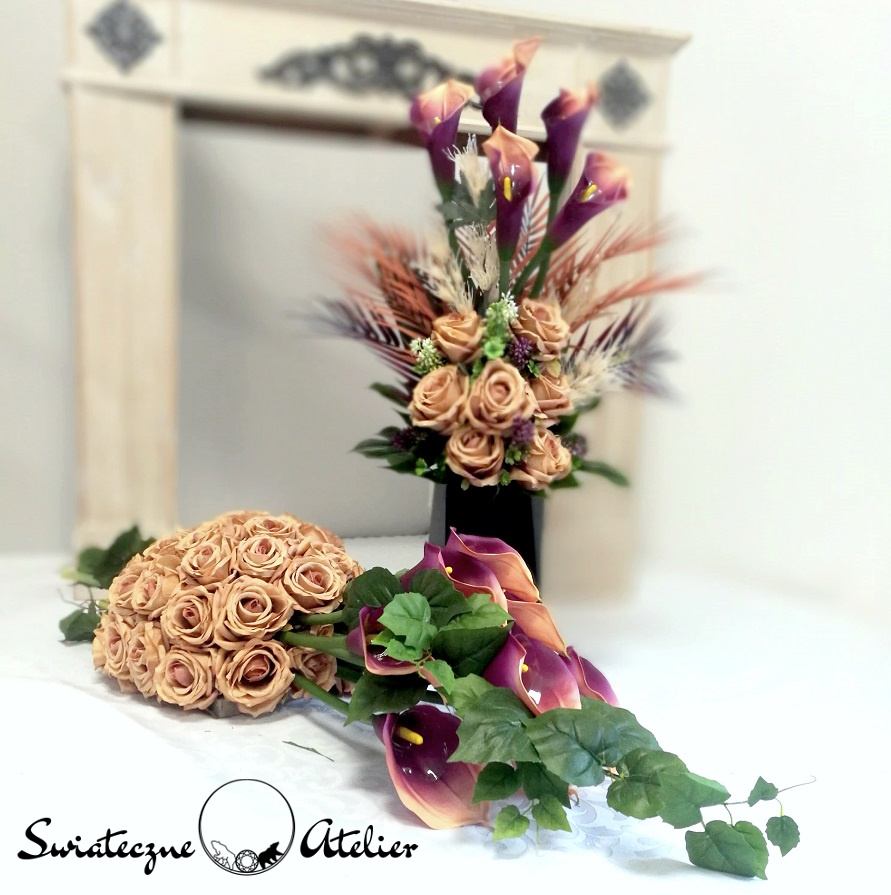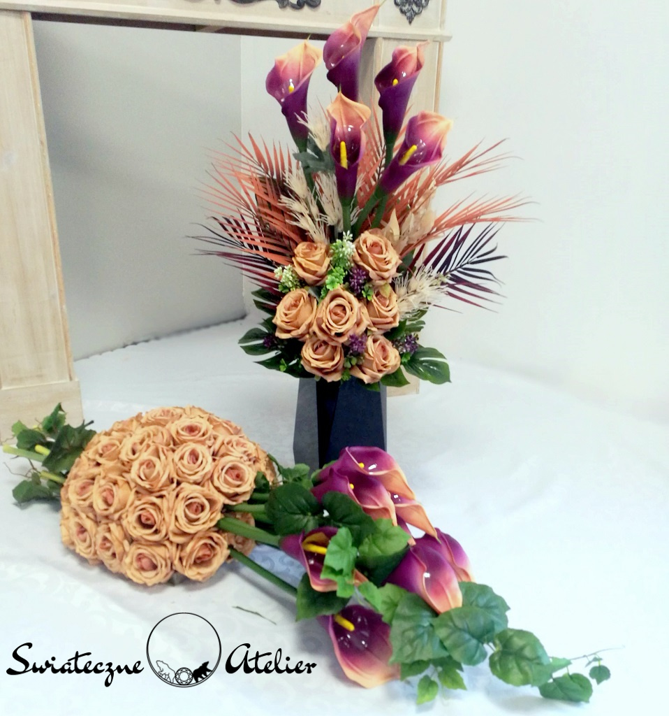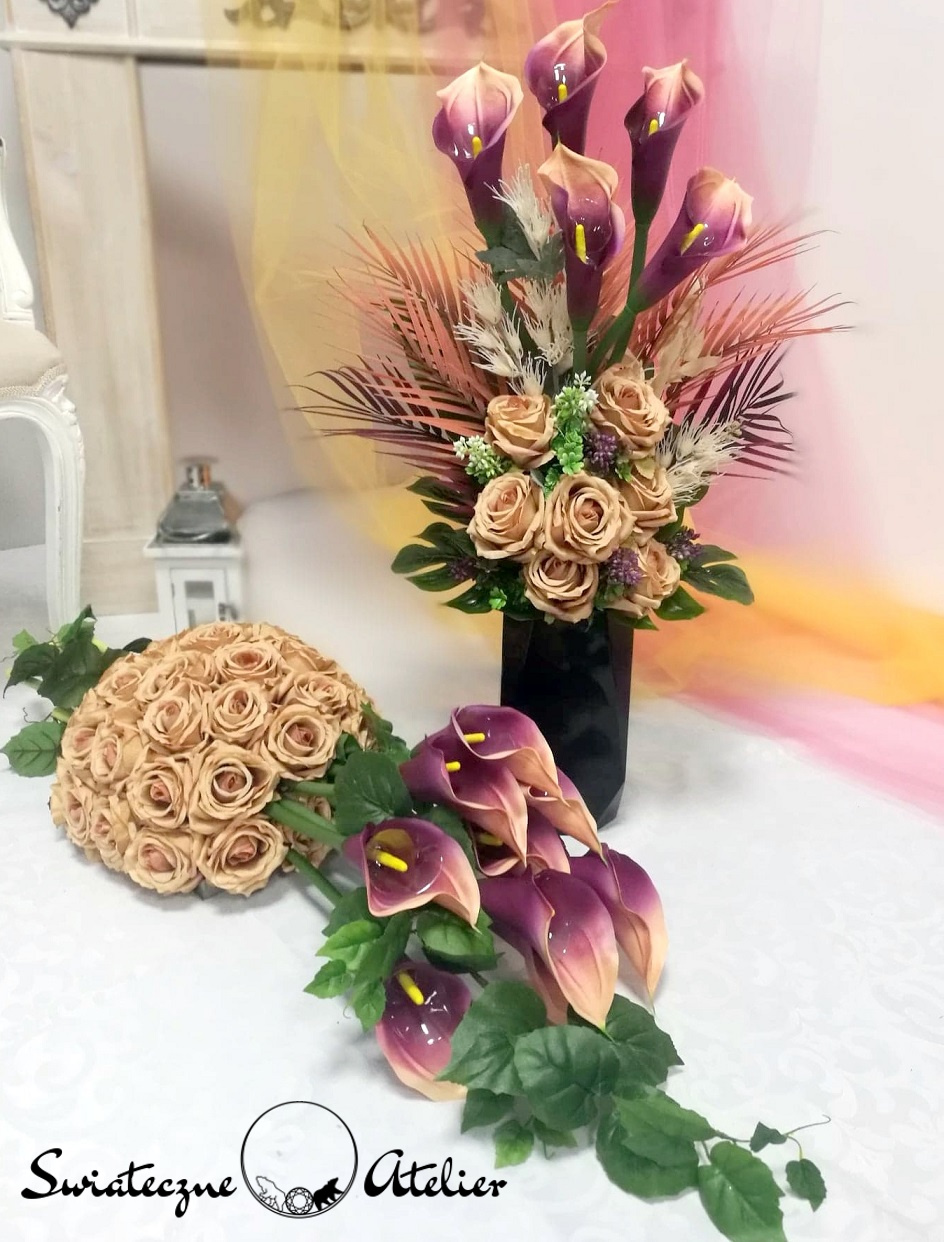 Bukiety w zestawie są strzeliste, z pięknymi powyginanymi kaliami.