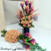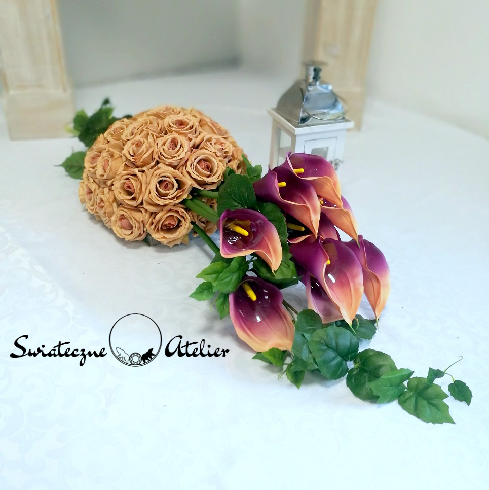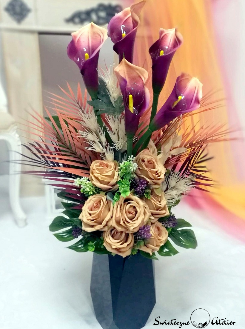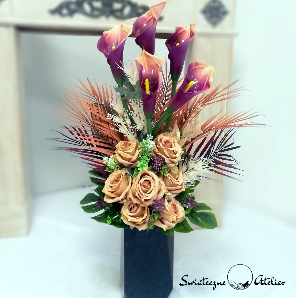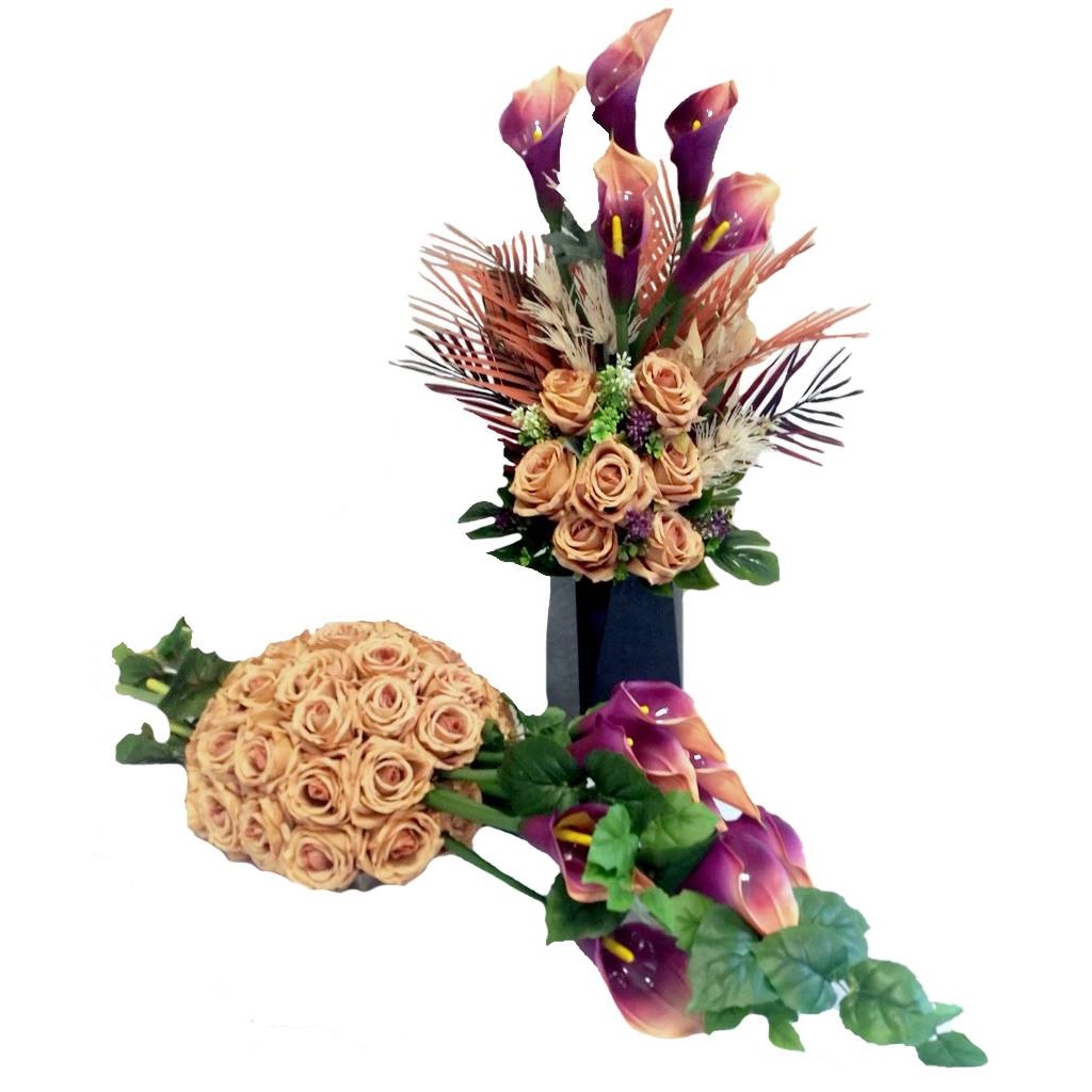 Zestaw nagrobny w Cieniu Kasztanowca nr 380 to unikatowa i piękna kompozycja kwiatowa. Całość składa się z kompozycji leżącej oraz bukietu. Kompozycja jest przede wszystkim jest niezwykle elegancka i duża. Składają się na nią kolejno: róże i gumowe kalie. 10 kalii w kolorze fiolet z cappuccino o długości 72 cm ułożyliśmy warstwowo w kuli kwiatowej. Całość osadziliśmy na betonowej podstawce, by zabezpieczyć kompozycję przed wiatrem. Kalie i róże pięknie ze sobą współgrają tworząc harmonijną całość.