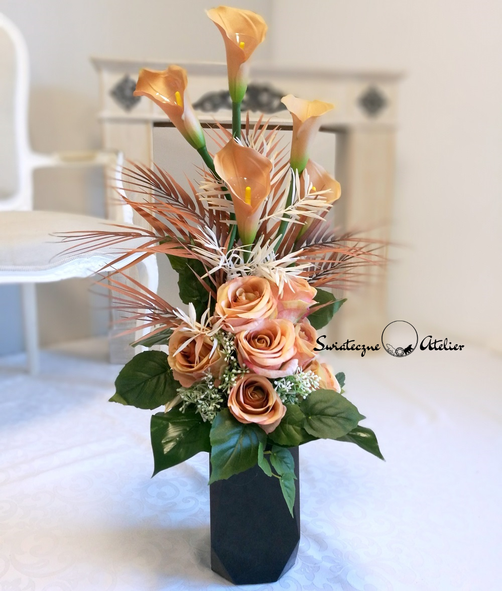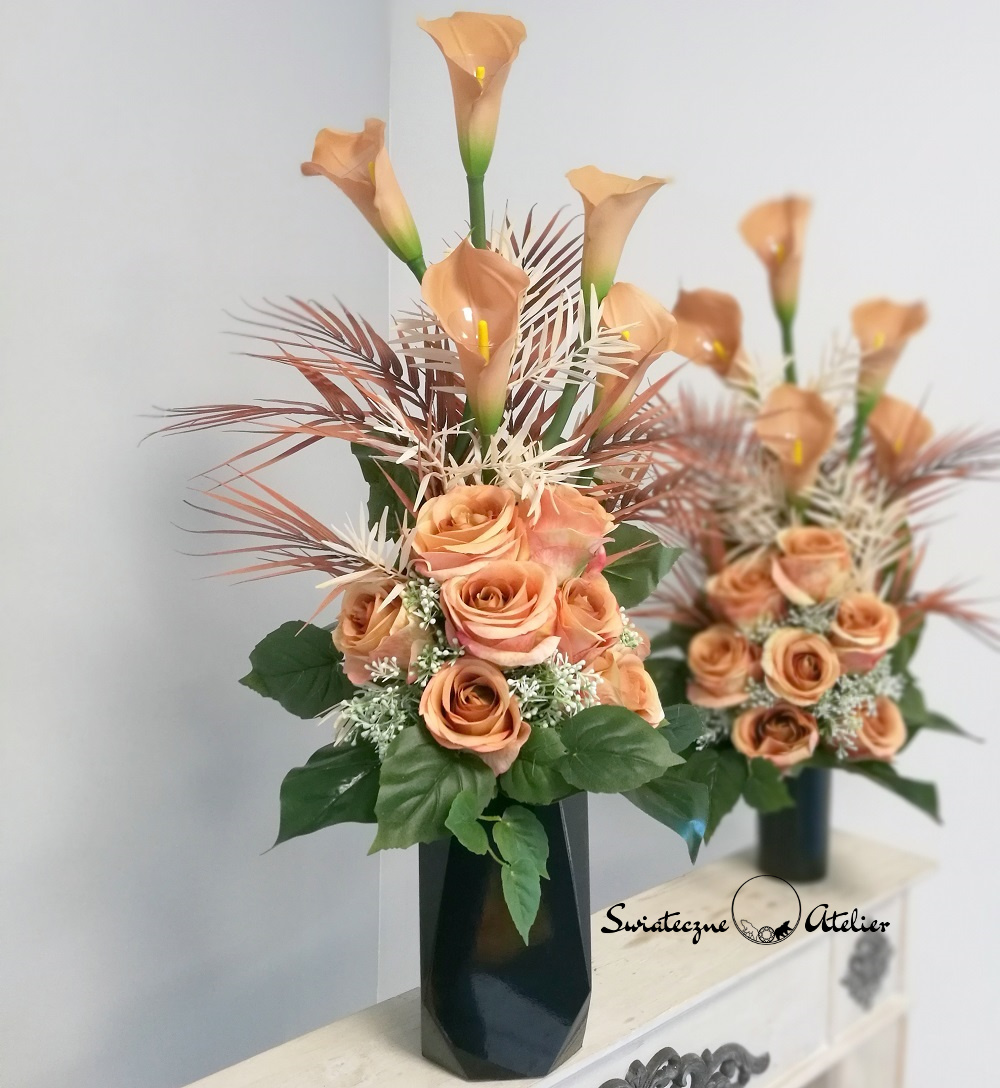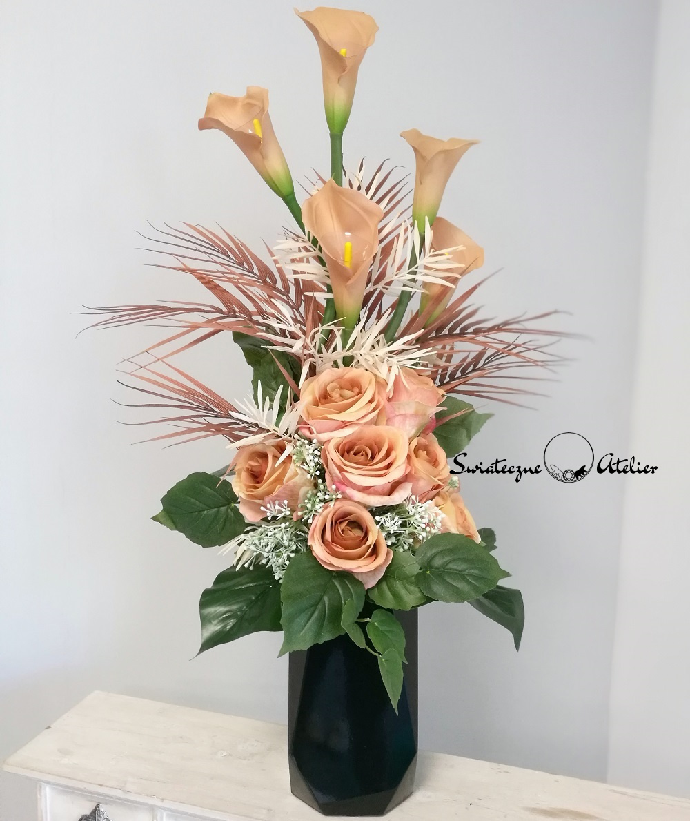 Zestaw nagrobny w Cieniu Kasztanowca nr 380 to unikatowa i piękna kompozycja kwiatowa. Całość składa się z kompozycji leżącej oraz bukietu.  Kompozycja przede wszystkim jest niezwykle elegancka i duża. Składają się na nią kolejno: róże i gumowe kalie. 10 kalii w kolorze cappuccino o długości 72 cm ułożyliśmy warstwowo w kuli kwiatowej. Całość osadziliśmy na betonowej podstawce, by zabezpieczyć kompozycję przed wiatrem. Kalie i róże pięknie ze sobą współgrają, więc tworzą harmonijną całość.