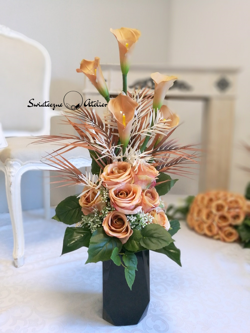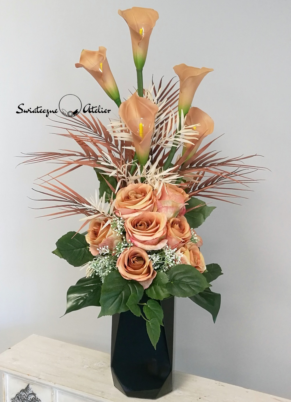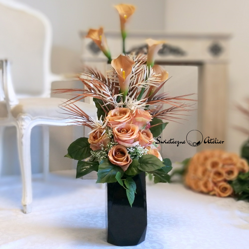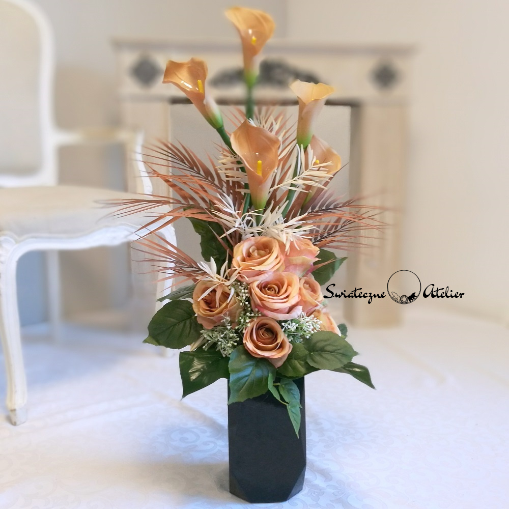 Zestaw nagrobny w Cieniu Kasztanowca nr 380 to unikatowa i piękna kompozycja kwiatowa. Całość składa się z kompozycji leżącej oraz bukietu.  Kompozycja przede wszystkim jest niezwykle elegancka i duża. Składają się na nią kolejno: róże i gumowe kalie. 10 kalii w kolorze cappuccino o długości 72 cm ułożyliśmy warstwowo w kuli kwiatowej. Całość osadziliśmy na betonowej podstawce, by zabezpieczyć kompozycję przed wiatrem. Kalie i róże pięknie ze sobą współgrają, więc tworzą harmonijną całość.