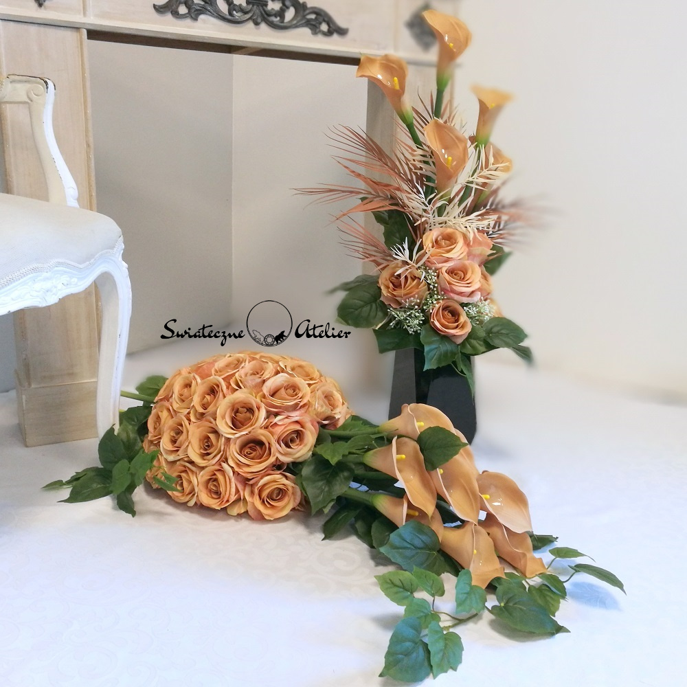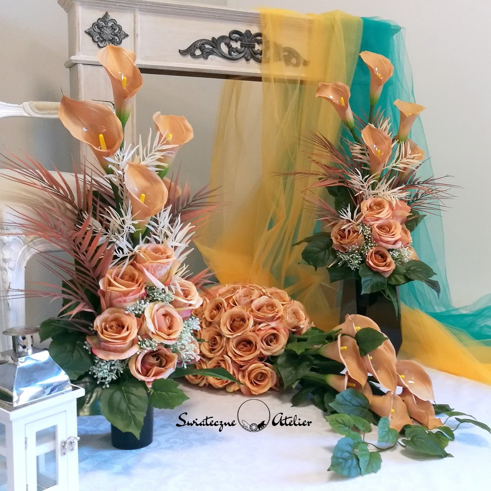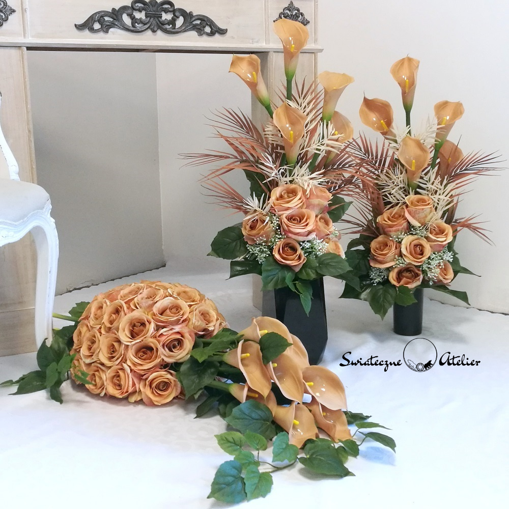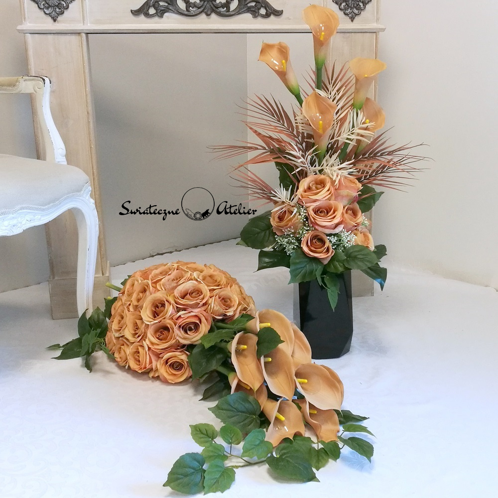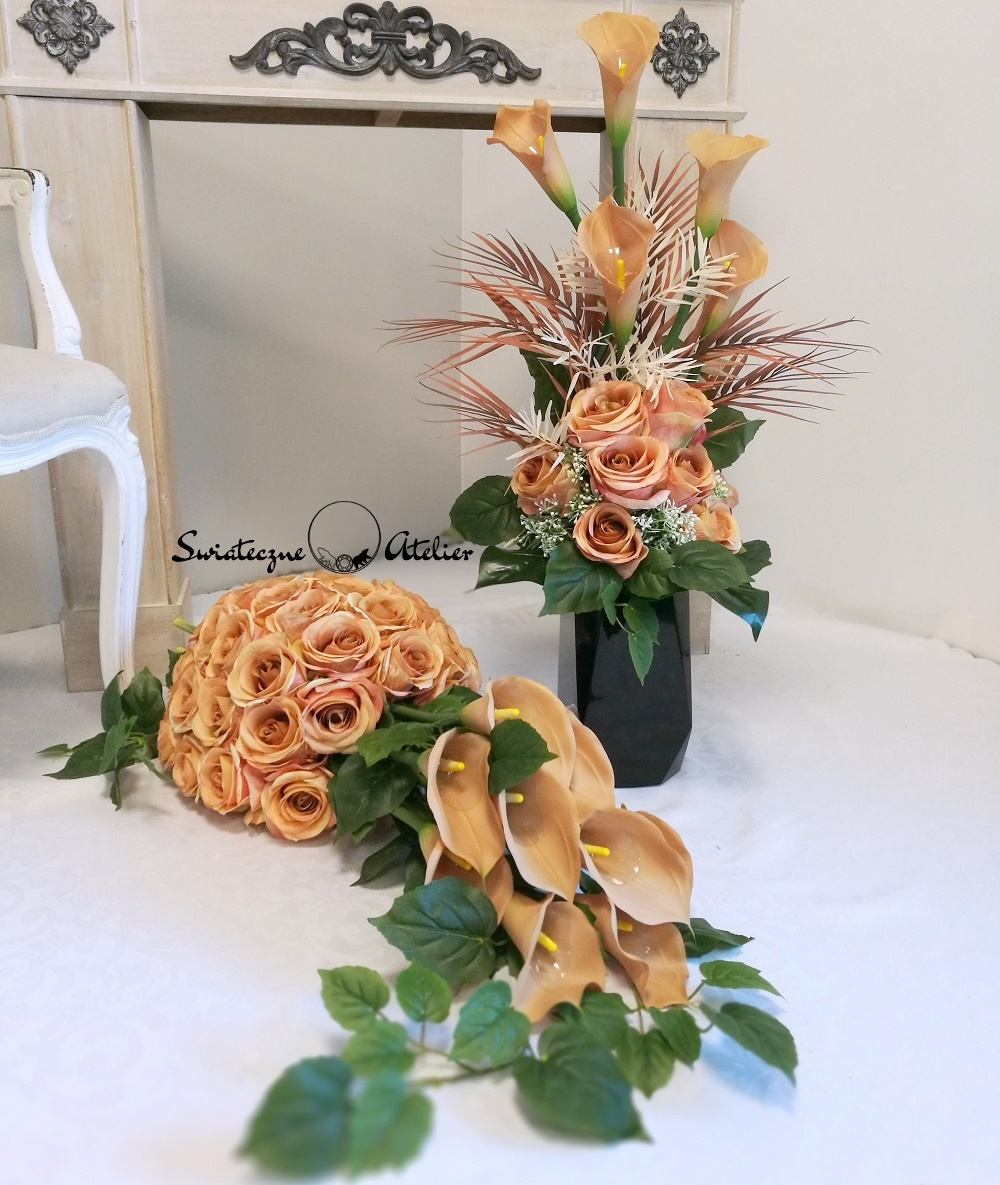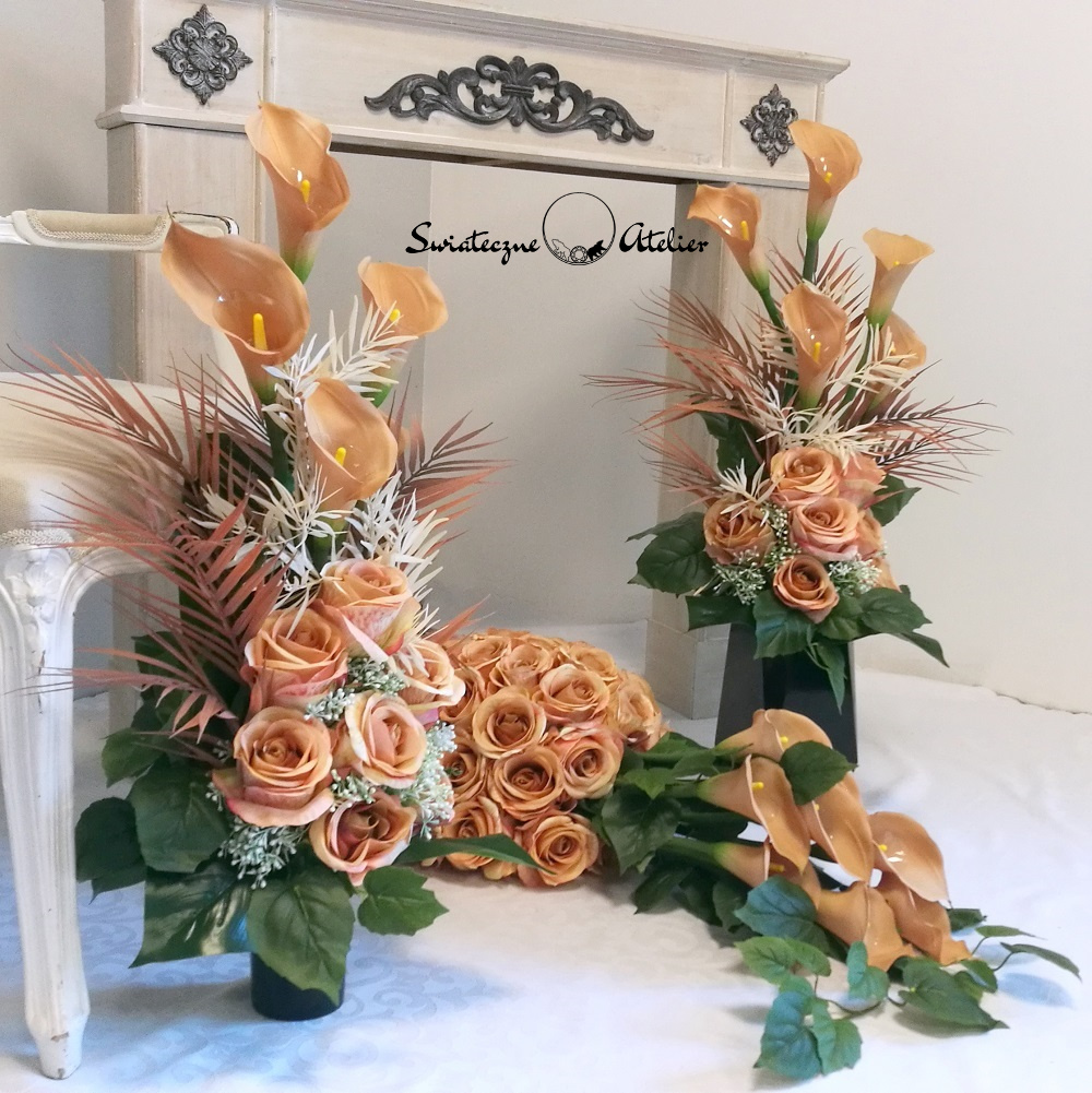 Bukiety, jakie tworzymy do zestawu są strzeliste, w kolorze naturalna biel, z pięknymi powyginanymi kaliami.