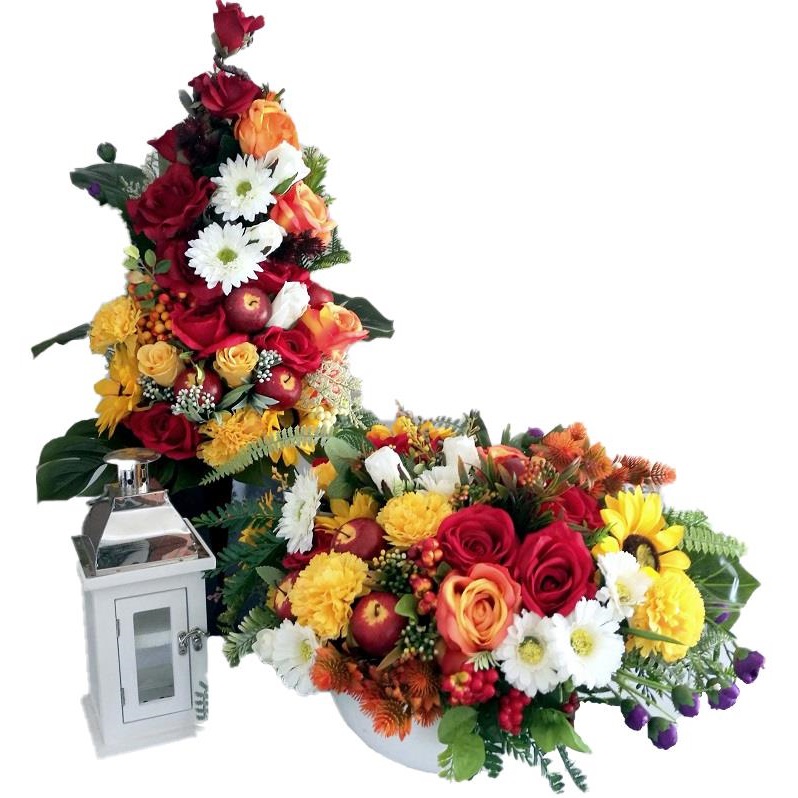 Zestaw nagrobny Wrzesień nr 336 jest to nietuzinkowa kompozycja kwiatowa. Bukiet umieściliśmy w plastikowym wkładzie do bukietu, a stroik na płytę w ceramicznej misie.  Przepiękne  kwiaty  wykorzystane w kompozycji zostały uzupełnione zielonymi elementami. Przepiękne jesienne róże, owoce kaliny i jarzębiny, klimatyczne paprocie, kolorowe gerbery tworzą wyjątkową dekorację. Kwiaty zastosowane do tej dekoracji nagrobnej są w pięknych kolorach i dekoracja niezależnie od pory roku będzie prezentować się pięknie.  Prosta forma nadaje kompozycji lekkości i elegancji.  Wysokiej jakości kwiaty oraz harmonia kompozycji pięknie będzie prezentować się zarówno na ciemnym jak i jasnym nagrobku. Zielone elementy podkreślają kolor kwiatów. Dekoracja niespotykana i przepiękna. Bukiet to bogata dekoracja umieszczona w plastikowym wkładzie.