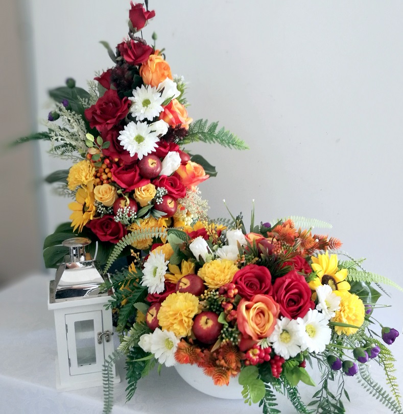 Wszystkie kwiaty wykorzystane w kompozycji to wysokiej jakości sztuczne kwiaty. Jest to elegancka alternatywa dla tradycyjnych wiązanek, sprzedawanych pod cmentarzami.