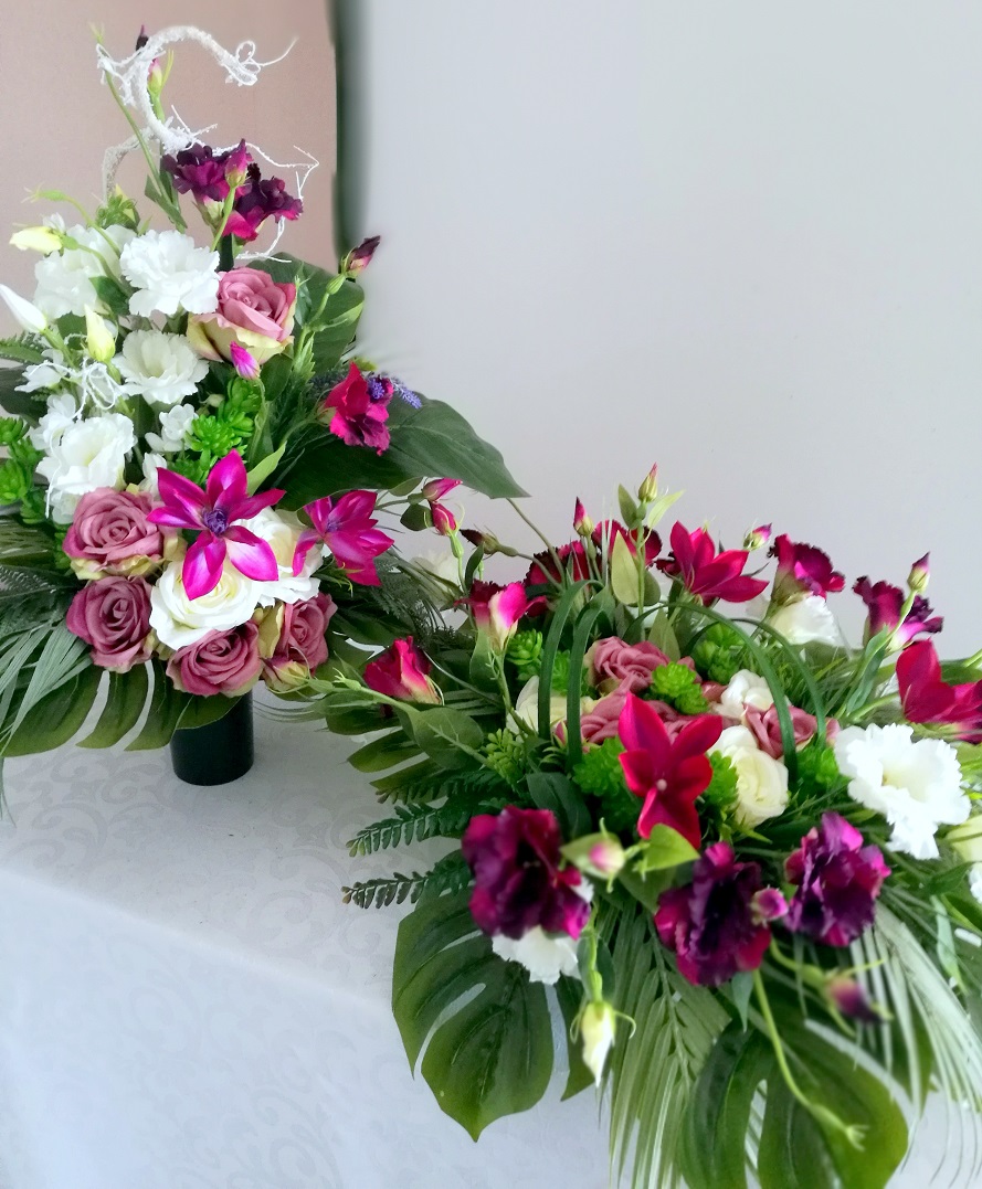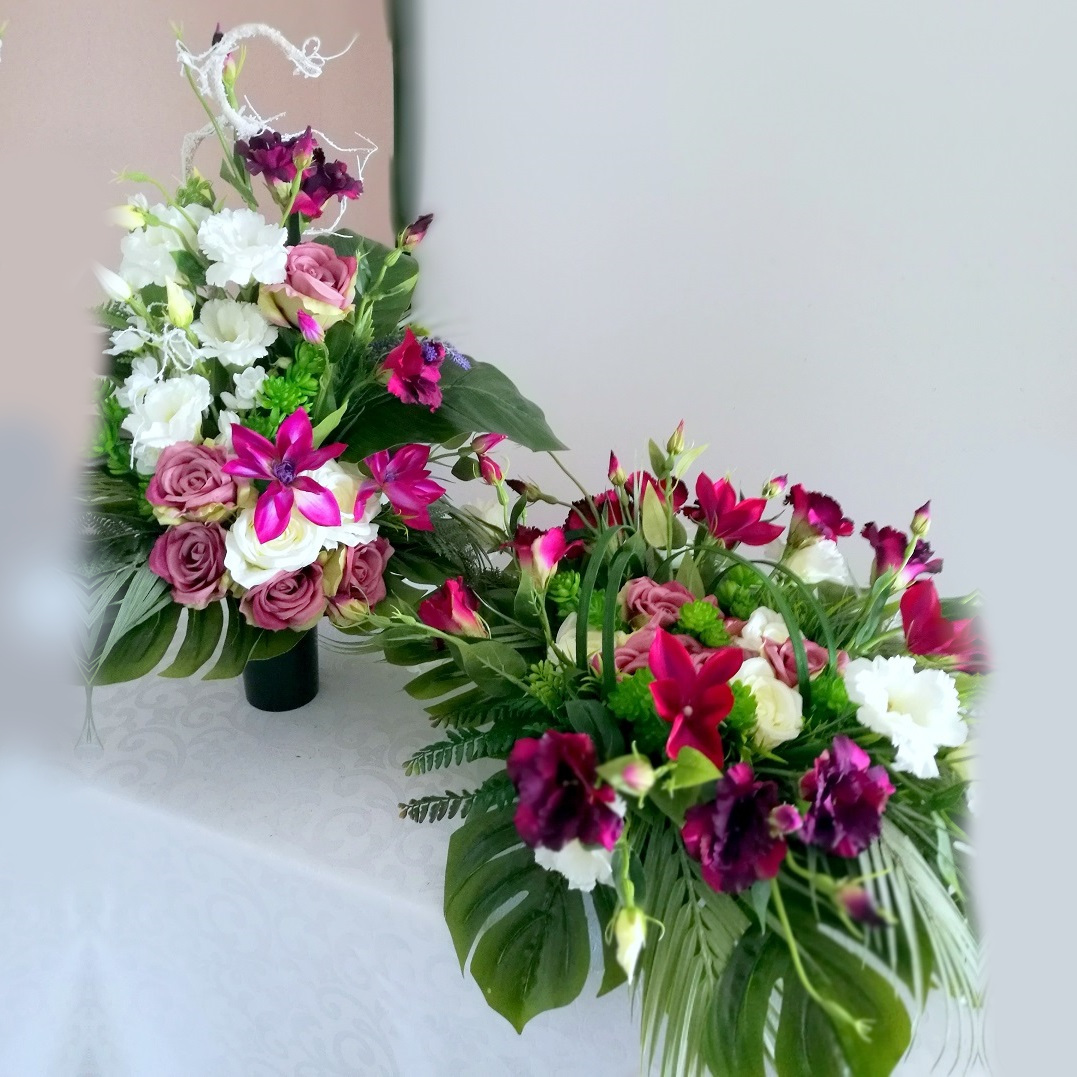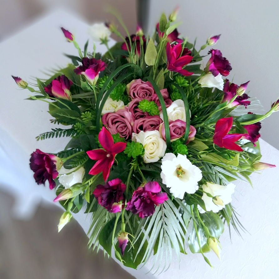 Wszystkie kwiaty wykorzystane w kompozycji to wysokiej jakości sztuczne kwiaty. Jest to elegancka alternatywa dla tradycyjnych wiązanek, sprzedawanych pod cmentarzami.