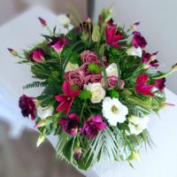Zestaw nagrobny Zorza nr 245 jest to unikatowa i nietuzinkowa kompozycja kwiatowa składająca się z bukietu oraz kompozycji leżącej. Stroik leżący to niezwykle elegancka i duża dekoracja. Na dekorację nagrobną składają się głównie róże i eustomy uzupełnione elementami zielonymi. Elementy zielone zastosowane w tej kompozycji nagrobnej to: paproć, liście palmy oraz liście monstery, uzupełnione drobnymi kwiatami i owocami. Całość osadzona jest w betonowej donicy by zachować stabilność przy zmiennych, typowych dla naszego klimatu, warunkach pogodowych . Prosta forma nadaje kompozycji lekkości i elegancji.Eustomy i róże pięknie ze sobą współgrają tworząc harmonijną całość. Bukiet oraz stroik praktycznie na każdym nagrobku będzie się prezentować pięknie ze względu na swoją okazałą formę oraz piękną kolorystykę. Bukiet umieszczony we wkładzie dzięki strzelistej formie i pęknej kolorystyce nikogo nie pozostawi obojętnym.