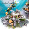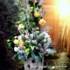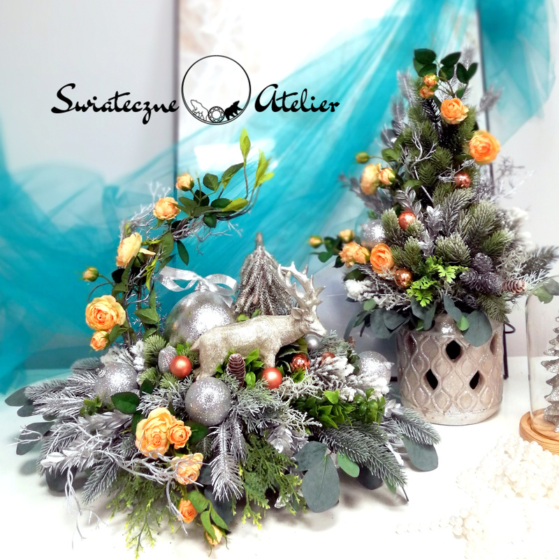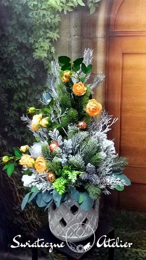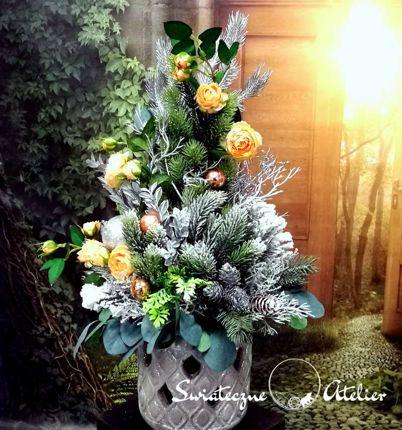 Zimowy stroik nagrobny z bukietem nr 1355 to unikatowa i piękna kompozycja kwiatowa.  Bukiet został umieszczony w plastikowym wkładzie, a stroik w obciążonej donicy. Kompozycja została ozdobiona świątecznymi dodatkami, które pięknie podkreślają kolorystykę. Uroczy jeleń, bombki,  sztuczne owoce nadają świątecznego charakteru. Dekorację uzupełniają różyczki w ciepłym kolorze.