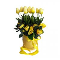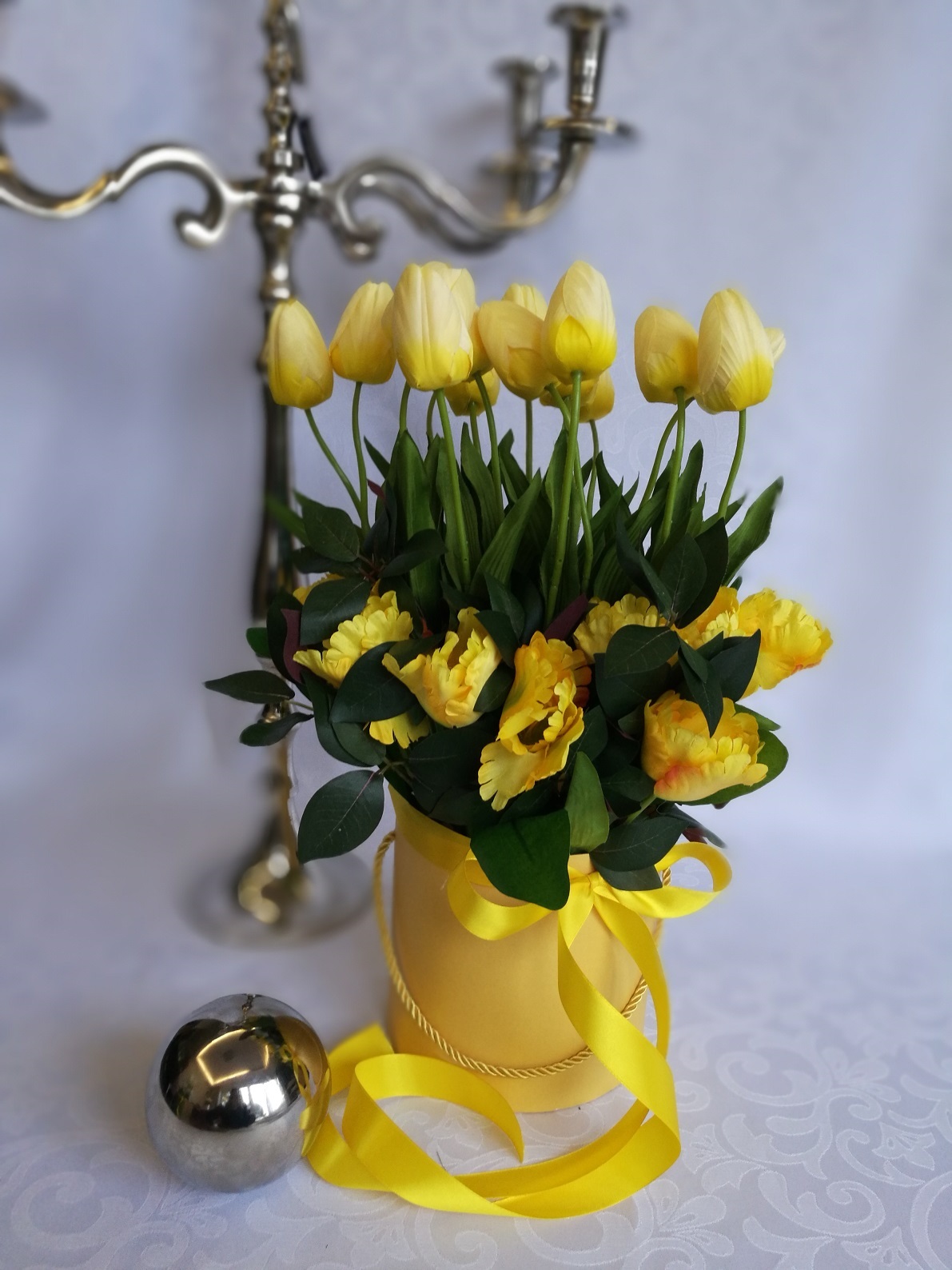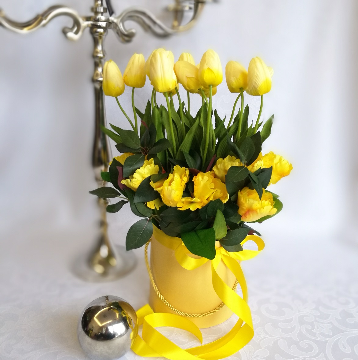 Żółte tulipany w żółtym pudełku nr 176 to piękna, kompozycja umieszczona w żółtym flower boxie. Wysokiej jakości sztuczne kwiaty, tworzą niepowtarzalną, kompozycję. Rośliny do złudzenia przypominają naturalne. Żółte tulipany zostały uzupełnione zielonymi listkami i papuzimi tulipankami.. Kompozycja znakomicie nadaje się na prezent. Dekoracja jest urocza, jej prosta forma sprawdzi się w każdym wnętrzu, nadając świąteczno wiosennego charakteru. Fantastycznie będzie się prezentować w nowoczesnych wnętrzach zarówno formalnych jak i mniej formalnych. Utrzymana w pięknych kolorach wniesie radość do Waszych wnętrz i przywoła uśmiech na twarzy. Taką kompozycję możemy dla Was przygotować także w innych kolorach, dzwońcie, piszcie, pytajcie.